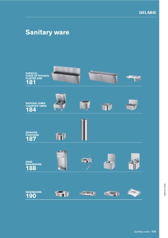 Sanitary ware SURGICAL SCRUB UP TROUGHS PLASTER SINK 181 DISPOSAL SINKS CLEANERS' SINKS 184 DRINKING FOUNTAINS 187 HAND WASHBASINS 188 SANITARY WARE WASHBASINS 190 Sanitary ware 179