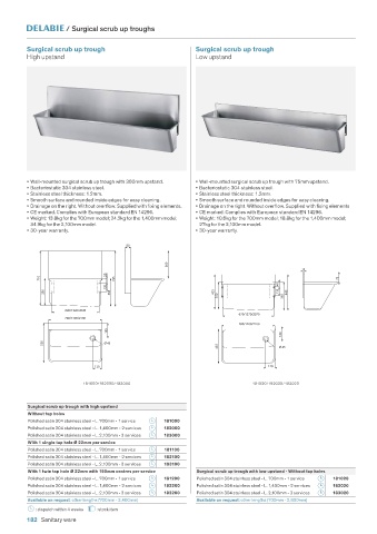 • Wall-mounted surgical scrub up trough with 360mm upstand. • Wall-mounted surgical scrub up trough with 75mm upstand.
