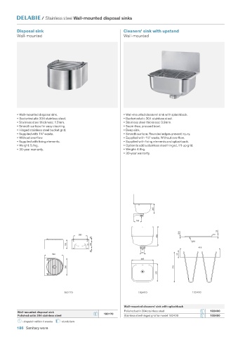 • Wall-mounted disposal sink. • Wall-mounted cleaners' sink with splashback.
