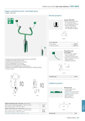 • Eye wash spray heads fitted with protective caps in green ABS; wash is activated.