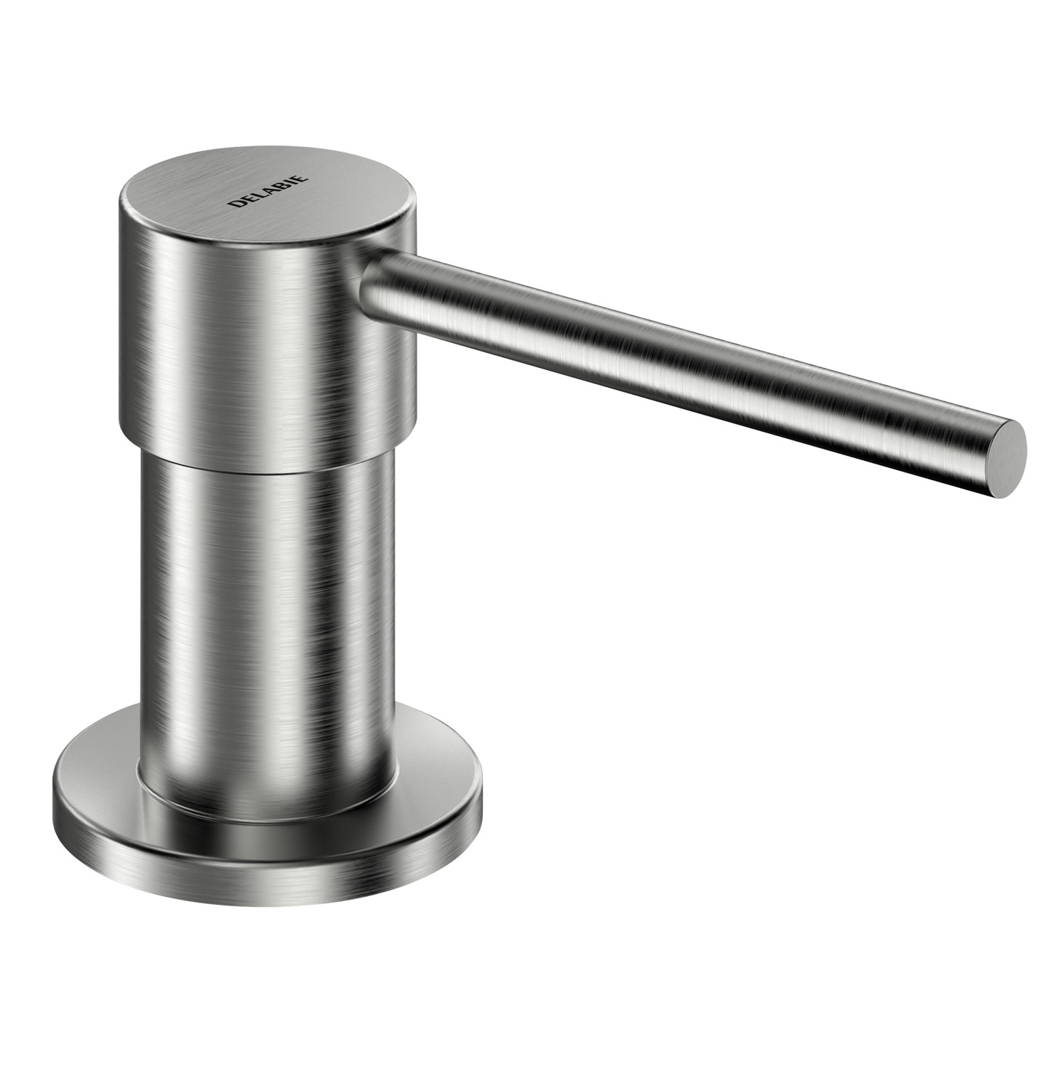 Deck-mounted liquid soap dispenser with 30-year warranty.