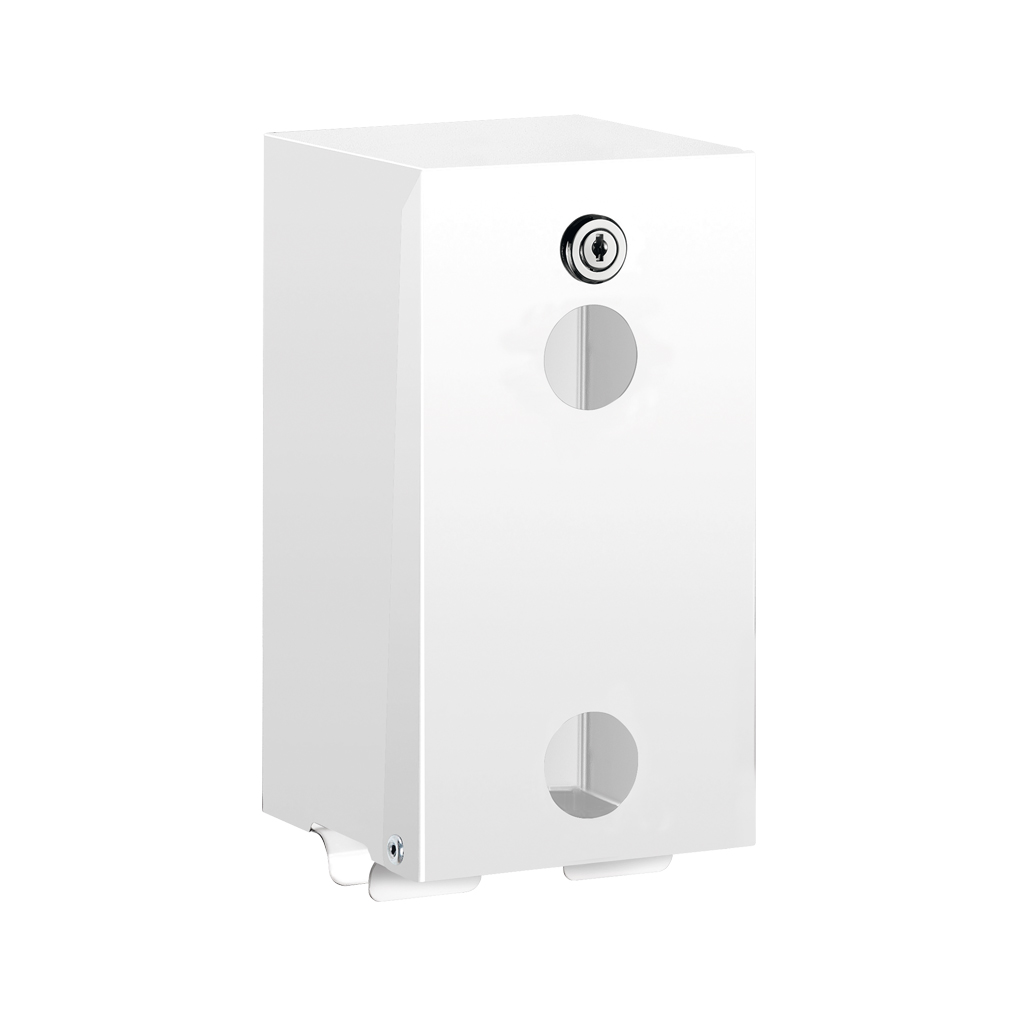 Toilet roll holder made from bacteriostatic white powder-coated 304 stainless steel.