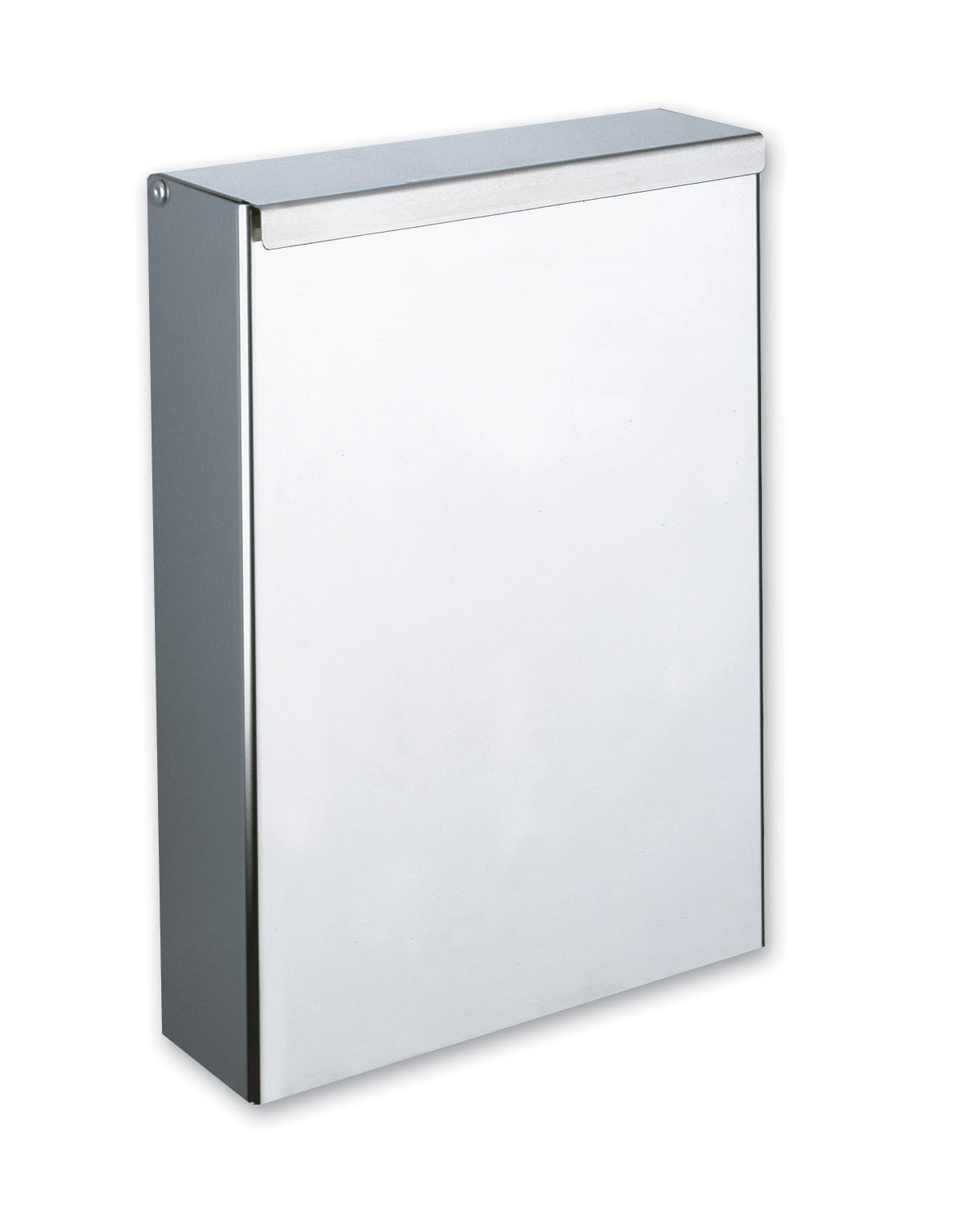Ref. 465Slimline wall-mounted rectangular stainless steel bin for paper towels and waste paper.
