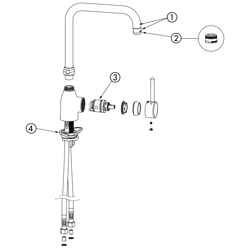 Single hole mechanical sink mixer with swivelling, tubular spout H. 220mm L. 200mm fitted with a hygienic flow straightener suitable for fitting a BIOFIL point-of-use filter.