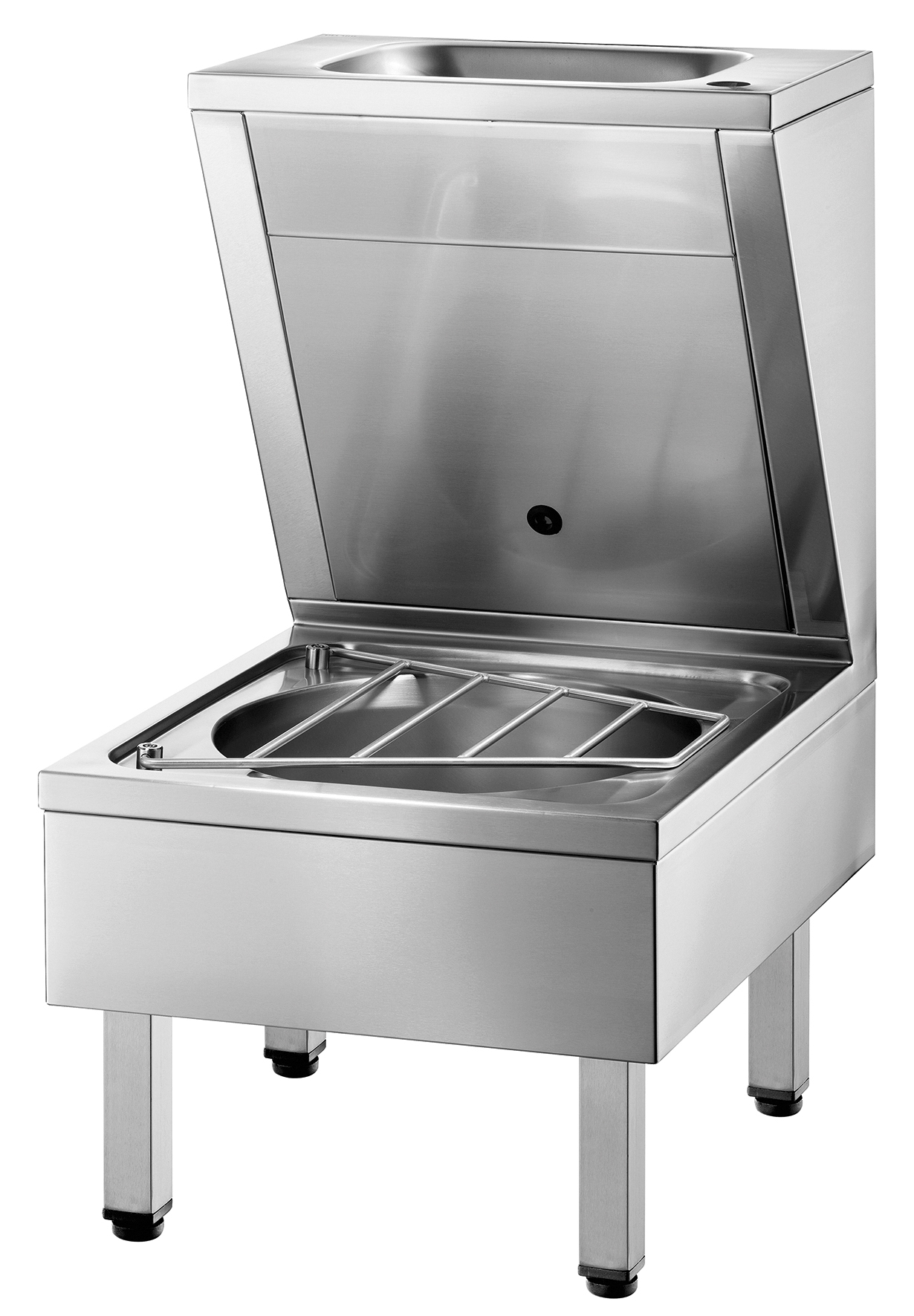Hinged stainless steel bucket grid.