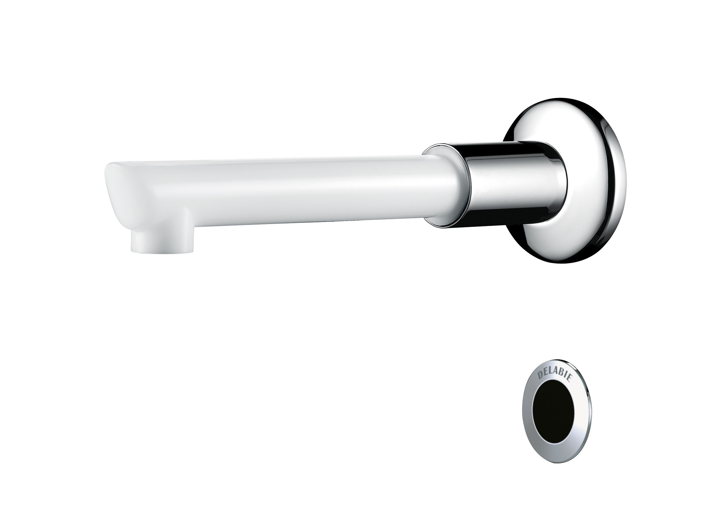Infrared sensor tap supplied with 1 removable, disposable spout made from recyclable Hostaform® L. 125mm.
