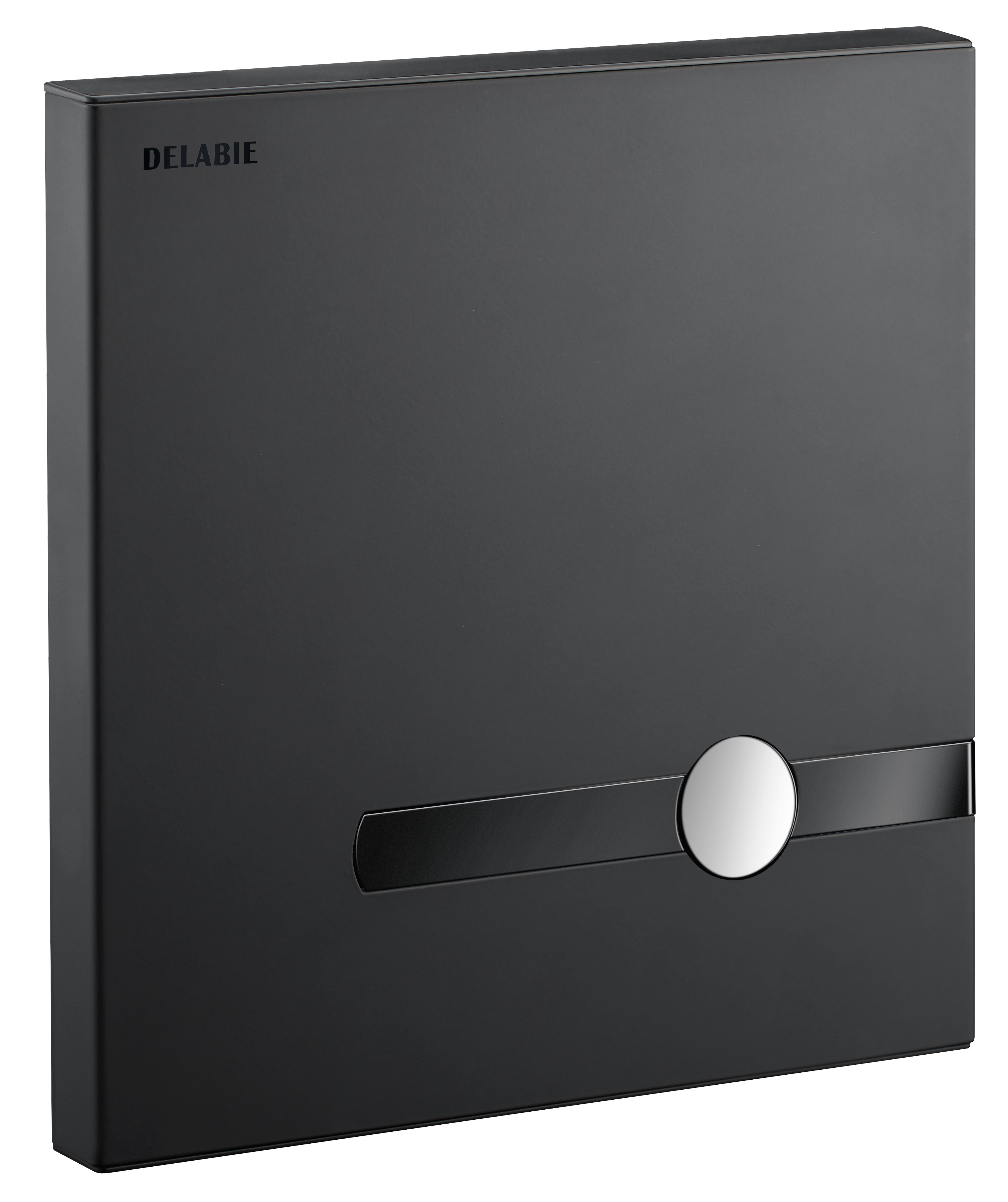 Matte black stainless steel wall plate 186 x 186mm and chrome-plated metal button, with integrated electronics.