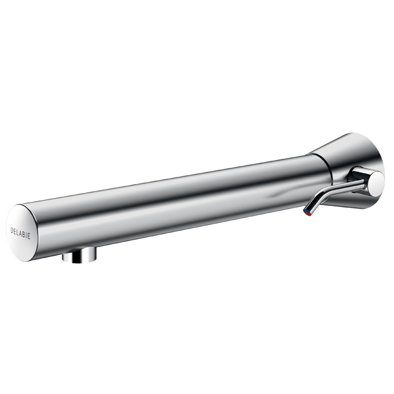 Wall-mounted stainless steel mixer.