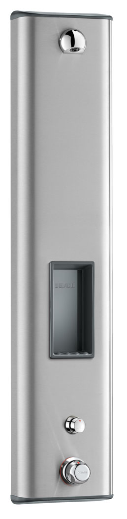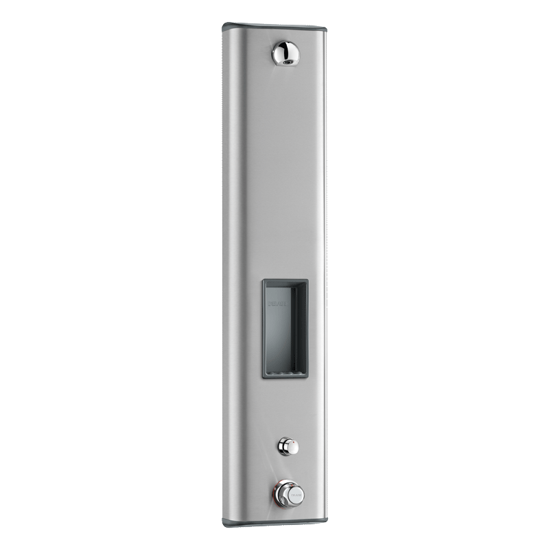 Large model satin stainless steel shower panel for wall-mounted, exposed installation.